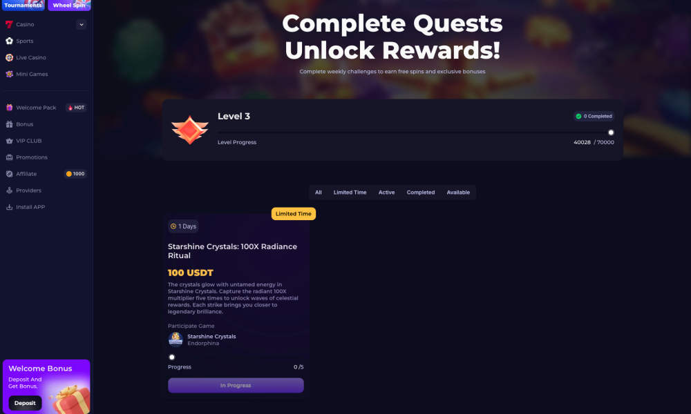 Jei ieškote platformos, kuri tikrai atlygintų už lojalumą ir aktyvumą, crypto-games.io siūlo galingą VIP klubą ir Quest sistemą, sukurtą augti kartu su jumis. Kuo daugiau statysite, tuo aukščiau pakilsite – ir tuo geresnis atlygis.