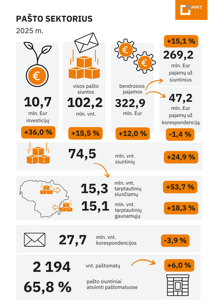Pašto sektorius Lietuvoje 2025 m. pagal bendrąsias pajamas augo 12 proc. – nuo 288,20 mln. Eur iki 322,90 mln. Eur, o bendras visų pašto siuntų skaičius didėjo 15,5 proc. – nuo 88,5 mln. iki 102,2 mln. vienetų. Pašto rinkos augimas buvo gerokai spartesnis nei BVP augimas.