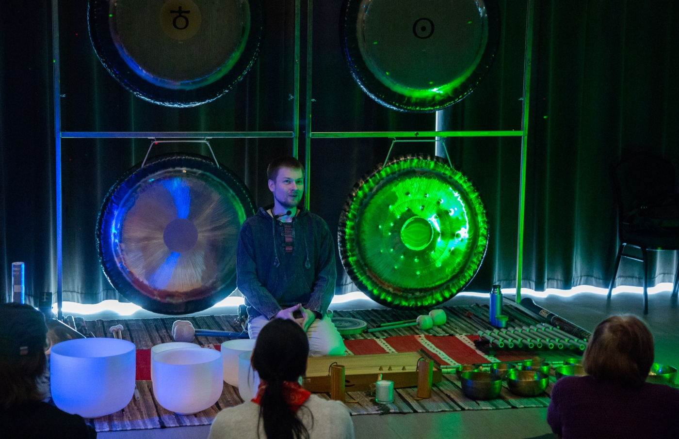 Garso sesiją vedė garso praktikas Artūras Arti. 2017 metais jis įgijo garso praktiko sertifikatą ir nuo tada veda patirtines garso keliones su gongais bei kitais archajiniais instrumentais įvairiose Lietuvos erdvėse.