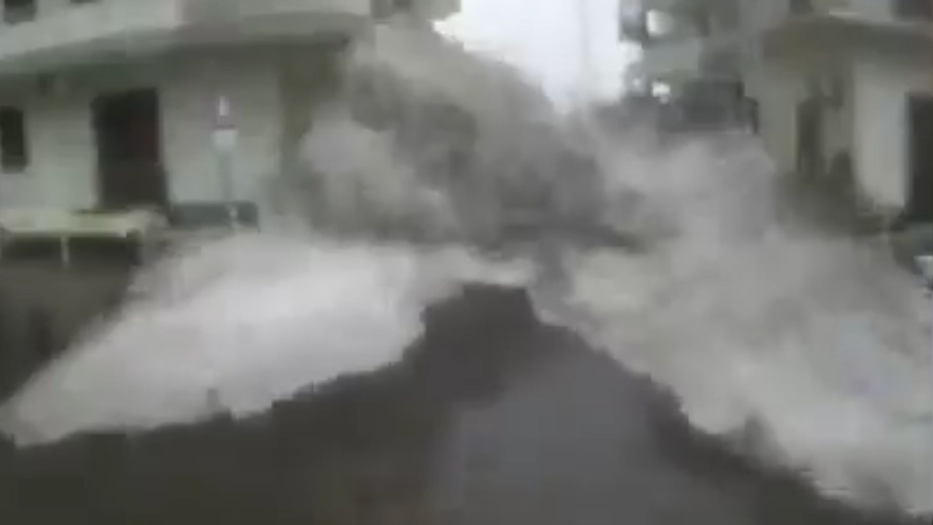 Kamera dreba, putplasčio sienoms atsitrenkus į prieplauką Lipari mieste, Sicilijoje, per kelias sekundes užtvindydamos gatves, o laivai smarkiai atsitrenkia į švartavimosi vietas.